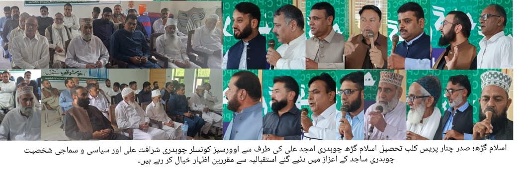 ۔جو لوگ آج سے ساٹھ سال قبل برطانیہ گئے تھے آج وآپس آتے ہیں تو ان کی زمینوں پر قبضہ کر لیا جاتا ہے ان سے اچھا سلوک کریں۔جو ذہن اور دل سے مرجاتا ہے وہ زندگی کے باوجود مر جاتا ہے ۔تارکین وطن کی جائیداد ان کو ملنی چائیے، صحافی بھائی اس معاملے کو اجاگر کریں اور جن لوگوں نے اہنا پیسہ پیسہ جوڑ کر بھیجا ہے ان سے ایسا سلوک نہ کریں۔سابق امیدوار اسمبلی حلقہ نمبر دو چکسواری سائیں ذوالفقار علی نے کہا کہ چودھری شرافت ایک چمکتا ستارہ ہیں برطانیہ کی پارلیمان تک پہنچے گئے۔ برطانیہ میں مقیم لوگوں نے بھی جوائنٹ ایکشن کمیٹی کا بہت ساتھ دیا۔میں پی ٹی آئی سے پہلے ایک کشمیری ہوں۔ابرار نیاز ایڈوکیٹ نے کہا کہ چنار پریس کلب اسلام گڑھ مواہ رڑاہ اور اسلام گڑھ کے لیے لازوال کام کر رہا ہے