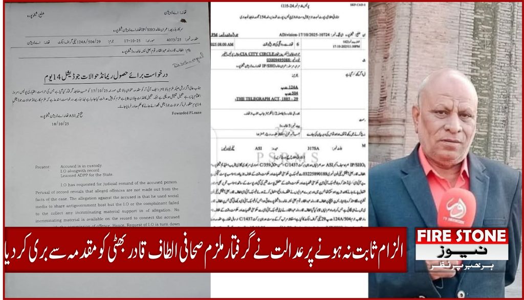 شیخوپورہ(بیوروچیف/شیخ محمد طیب سے) تھانہ سٹی اے ڈویژن شیخوپورہ میں درج مقدمہ نمبر 4073/25 بجرم 124-A، 504 ت۔پ اور ٹیلی گراف ایکٹ 29 میں گرفتار ملزم مقامی صحافی الطاف قادر بھٹی کے خلاف الزامات ثابت نہ ہونے پر فاضل ڈیوٹی جوڈیشل مجسٹریٹ سیکشن 30 شیخوپورہ سیدہ ماہ پارہ وجاہت نے مقدمہ ڈسچارج کرنے کا حکم دے دیا۔ تفصیلات کے مطابق ASI محمد مشتاق نے رپورٹ درج کروائی تھی