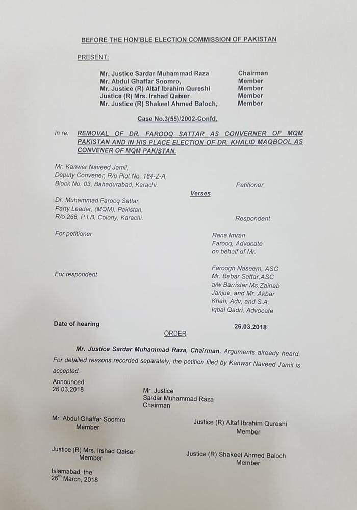 الیکشن کمیشن نے ایم کیو ایم پاکستان بہادرآباد گروپ کی درخواستیں منظور کرتے ہوئے فاروق ستار کی کنوینرشپ سے متعلق محفوظ کردہ مختصر فیصلہ سنایا